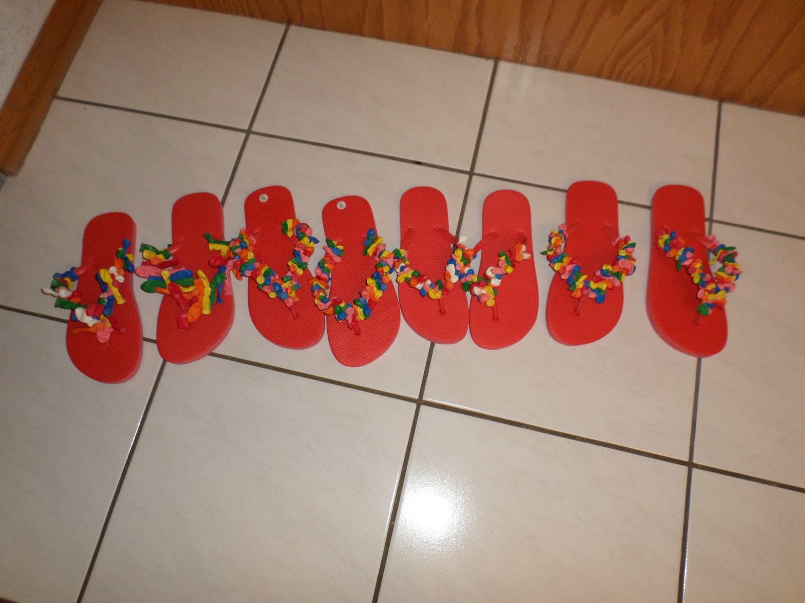 For a fun cheap craft we made these balloon flip flops. The flip flops were from the dollar store and I bought about 100 balloons per scout. The craft is so easy, all they have to do is tie the balloons around the tops of the flip flops. I recommend checking if any of your scouts have an allergy to latex. One ours did and we didn't know it until her face started to have red blotches on it. The girls had fun making the project and they looked so cute when they were done!